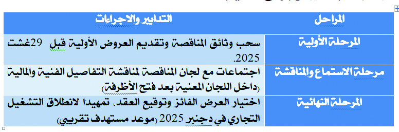 • وقد شملت عروض شركات متنافسة (شركة مغربية وشركة إسبانية) قدمت ملفاتها للمشروع، ويتوقع الإعلان عن الشركة المفوَّضة في الأسابيع القادمة.
