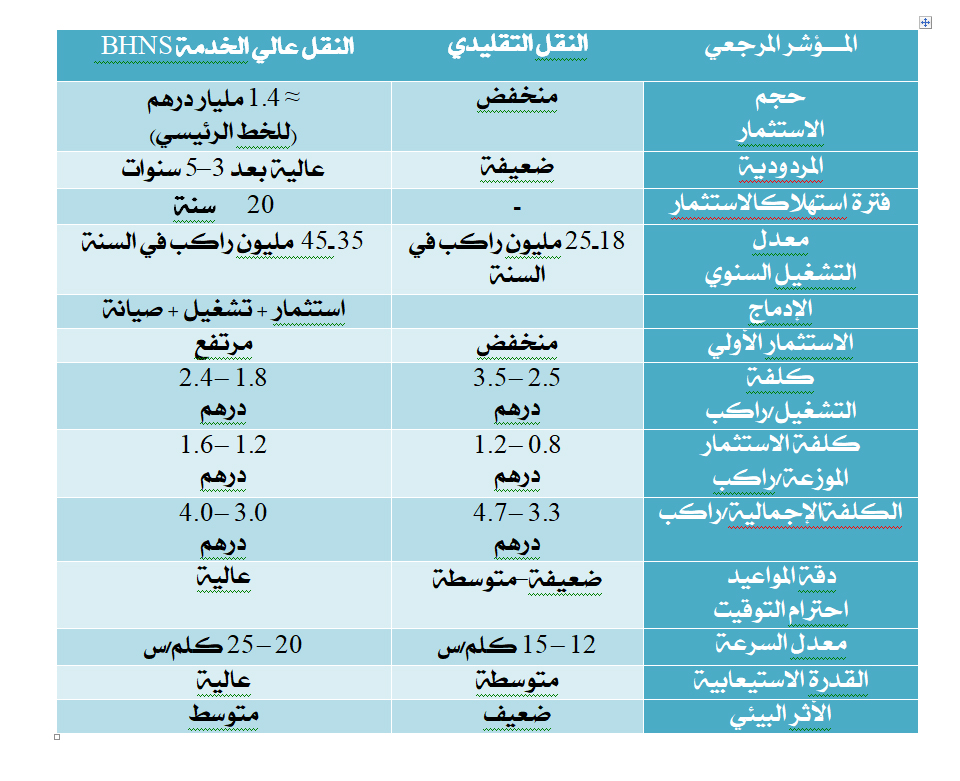 في تحليل مقارن بين النقل التقليدي بالحافلات والنقل بالحافلات ذات المستوى العالي من الخدمة (BHNS) يتضح أنه باعتماد مؤشرات الأداء والتكلفة، وضمان الدقة والاستفادة من أحدث المعطيات حول مشروع BHNS  في أكادير وجهة سوس ماسة يمكن تسجيل أهم الخصائص في المنظومتين كالتالي: