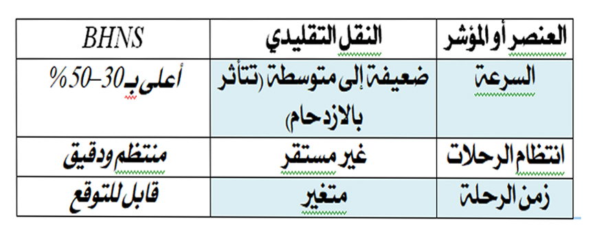 1. المقارنة بين النقل التقليدي بالحافلات والنقل بالحافلات ذات المستوى العالي من الخدمة (BHNS)