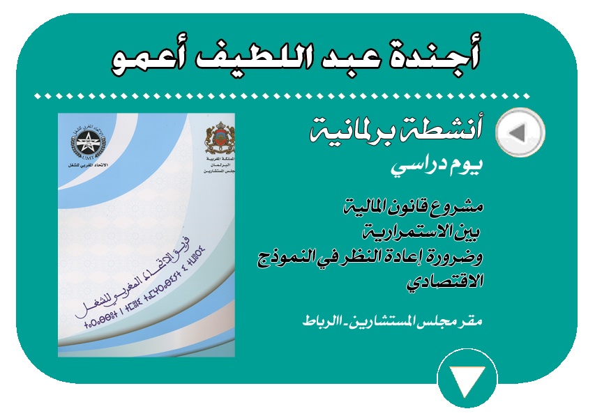 نظم فريق الاتحاد المغربي للشغل بمجلس المستشارين يوما دراسيا حول موضوع: “قانون المالية بين الاستمرارية وضرورة إعادة النظر في النموذج الاقتصادي” وفقا للبرنامج التالي: